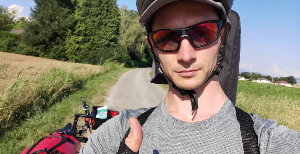 Départ du Nord Isère, le but de cette étape sera de trouver la ViaRhôna (EuroVelo 17), direction Genève. Je ne vais pas faire des mille et des cent aujourd’hui, vue l’heure déjà tardive, mais à un moment donné il faut partir ! D’ailleurs je pars chargé à bloc ! Comme c’est la première fois que je fais de l’itinérance à vélo, je n’ai aucune idée de l’impact que ça va avoir sur mon physique, de combien d’eau et nourriture je vais avoir besoin etc, donc j’ai rempli ma poche d’eau avec 4 L (camping sauvage oblige), j’ai des fruits, dont un melon (l’avantage c’est que c’est léger !), et 2/3 autres conneries. Et comme j’ai pas de balance chez moi, je n’ai aucune idée du poids que ça fait. Mais c’est lourd – de ouf ! Ca va m’endurcir, c’est bien ! On ne fait pas toujours dans la dentelle !