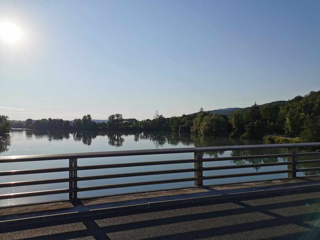 Bon, j’ai dû faire 45 km en un truc du genre 2h. Je suis passé par Morestel, un joli village isérois de type médiéval, comme beaucoup dans le coin. À Morestel, j’ai trouvé comme prévu l’itinéraire ViaRhôna, que j’ai pris, direction plein nord, pour rejoindre Genève dans je ne sais pas combien de temps encore.