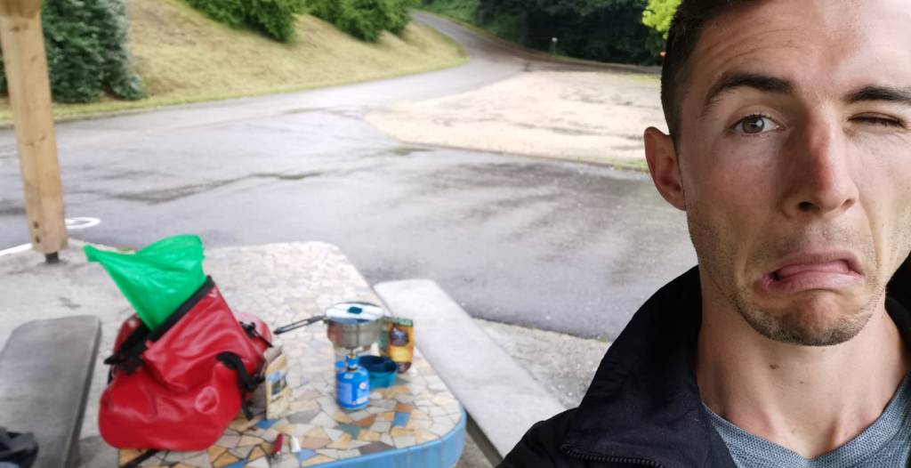 J’ai installé le campement. La tente a l’air d’aller, le matelas de sol aussi. Je suis grave content de commencer ce voyage !